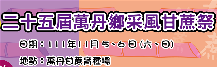 受到廣大民眾熱情參與的屏東地區年度盛事「萬丹甘蔗祭文化活動」,將於本週六、日一連兩天在萬丹甘蔗育種場熱鬧登場。台糖公司邀請全臺各地的民眾「蔗」伙來萬丹走走,一起重溫及體驗甘蔗農村文化的生活景況。